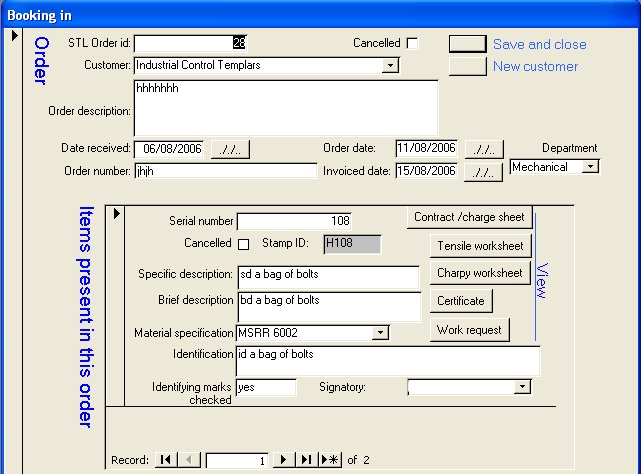 Screen shot of the booking in screen of the TestTrac LIM system.